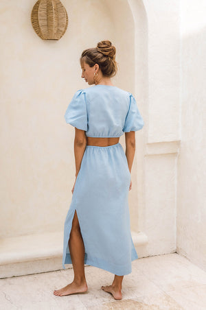 Crafted from 100% premium French-flax linen, the MERAKI Midi Dress features a delicate twist detail at the plunging V-neckline, with puff sleeves adding a touch of timeless charm. Its elasticated waistband and side slits offer a comfortable and flattering fit for any occasion, whether a garden soirée or a sunny get-away. This sustainable linen design combines beauty and sophistication, coming without lining for added breathability in warm climates.