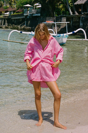 Relaxed oversized tailoring at its best! Crafted from super soft, light-weight 100% French flax linen, this throw-on shirt-dress in warm hues will be your go-to this summer. Thanks to the cooling characteristics of linen, you will feel breezy and luxurious even in warm climates. And it has so many ways to style it! Elevate your wardrobe by layering it over your favourite staples or swimmers, combine it with our matching SUMMER Shorts and style it with your favourite minimal jewellery. Take this all-rounder from daytime to nighttime, city to vacations - this high-rotation piece is made to last.