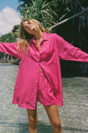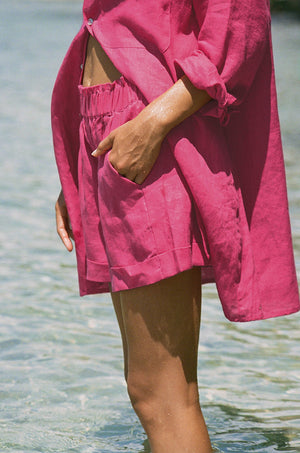 Such an effortless essential for your holidays and beyond! The highly flattering design of our SUMMER shorts and their super soft feel of light-weight, 100% French flax linen make them the perfect addition to your wear-forever summer wardrobe. They feature an elasticated waistband for extra comfort and side pockets with beige lining to reduce transparency. Style them with our SUMMER linen shirt-dresses for an instant sophisticated sunshine outfit you will live in all summer long.