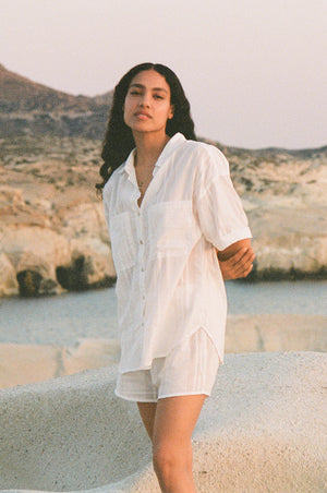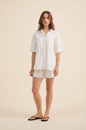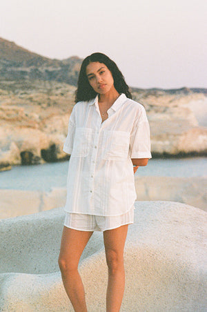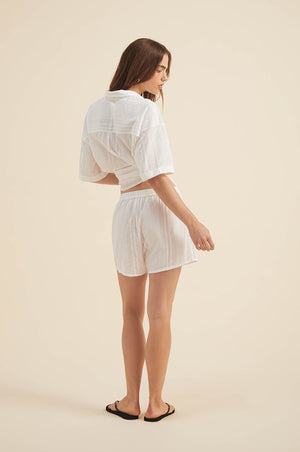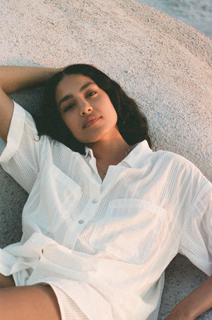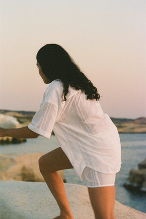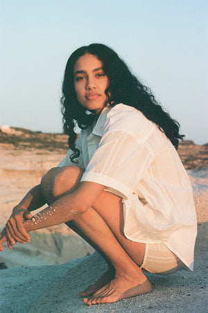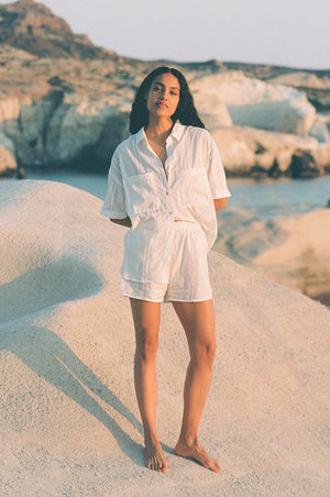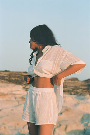 Our striped cotton matching set is ideal for your summer days ahead! The slightly boxy fitted shirt with matching elasticated shorts in breezy, semi-sheer cotton will serve you well on your next sun-soaked holidays. Tailored in a pyjama-style fit, this perfect vacation outfit will look especially chic when paired with minimal jewellery and a raffia tote.